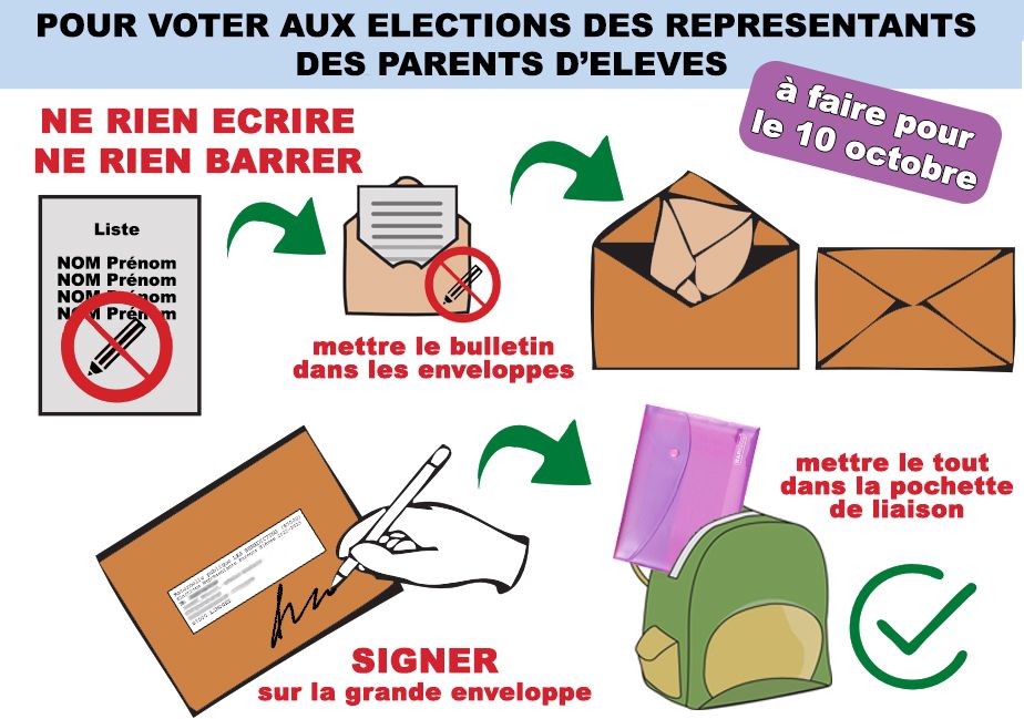 Votre enfant est reparti de l'école avec la pochette de liaison et des enveloppes marrons à l'intérieur. Il s'agit du matériel de vote pour l'élection des représentants d'élèves. Pour cette élection, on élit une liste de personnes, et non pas une personne en particulier. Cette année, une seule liste est candidate. Vous n'avez donc pas à rayer ou entourer, c'est toute la liste qui doit être choisie. (Si vous écrivez sur le bulletin, il sera considéré comme nul.)